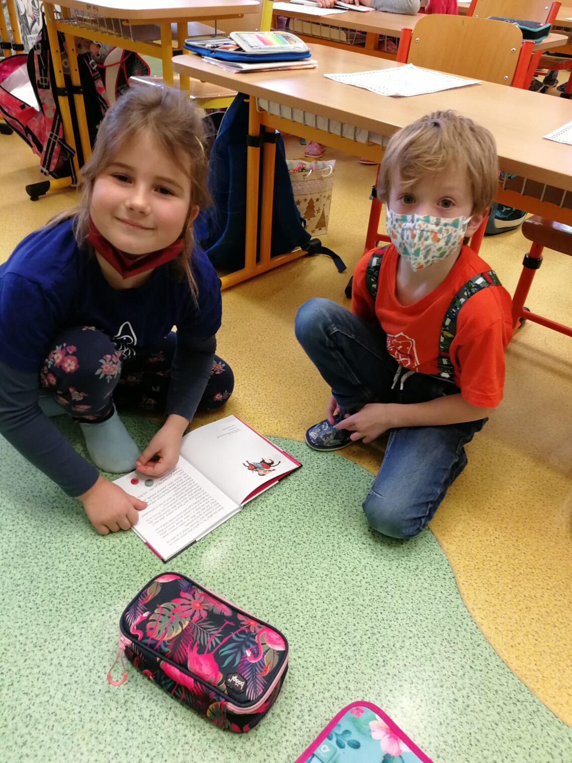 Než se všichni vrátili do svých lavic, čekal je ještě jeden úkol. Společnými silami poskládali puzzle s tajenkou o tom, že kdo je správný kamarád, má knížky a čtení rád. Děti nezaváhaly ani chviličku. Druháčci se chopili knížek o tetě, která kromě šály plete i pohádky, se svým prvňáčkem si našli někde místečko a dali se do čtení. Prvňáčci pozorně a se zaujetím naslouchali.